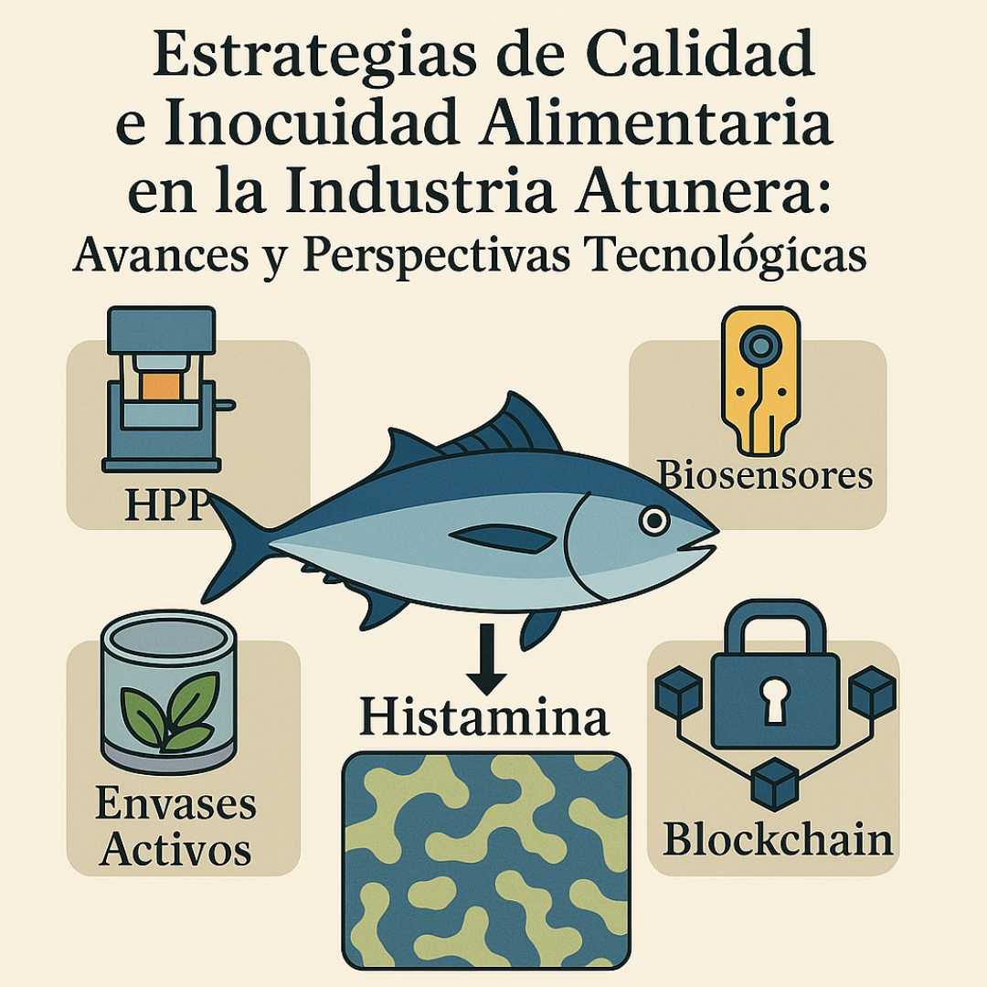 El sector atunero enfrenta crecientes desafíos en calidad e inocuidad alimentaria, impulsados por la necesidad de cumplir con normativas internacionales y responder a las exigencias del mercado global. Esta investigación analiza las estrategias actuales del sector y evalúa el impacto de tecnologías emergentes como el procesamiento por alta presión (HPP), biosensores, blockchain y envases activos. Se realizó una revisión de la literatura con el objetivo de examinar cómo estas innovaciones contribuyen al control de peligros microbiológicos y químicos, tanto tradicionales como emergentes. Los resultados muestran mejoras significativas: el HPP logra una reducción superior a 100 000 microorganismos viables por gramo de Listeria monocytogenes; los biosensores permiten detectar histamina en menos de 8 minutos; y los sistemas IoT integrados con blockchain reducen el tiempo de trazabilidad documental a menos de dos horas. Además, se observa un fortalecimiento en la trazabilidad, sostenibilidad y control de contaminantes críticos como histamina y mercurio. Estas tecnologías no solo optimizan los procesos productivos, sino que también disminuyen riesgos sanitarios y aumentan la competitividad internacional del sector. Se concluye que es prioritario estandarizar métodos analíticos para contaminantes emergentes y promover programas de formación técnica 4.0, lo que consolida un enfoque integral de calidad e inocuidad alimentaria.